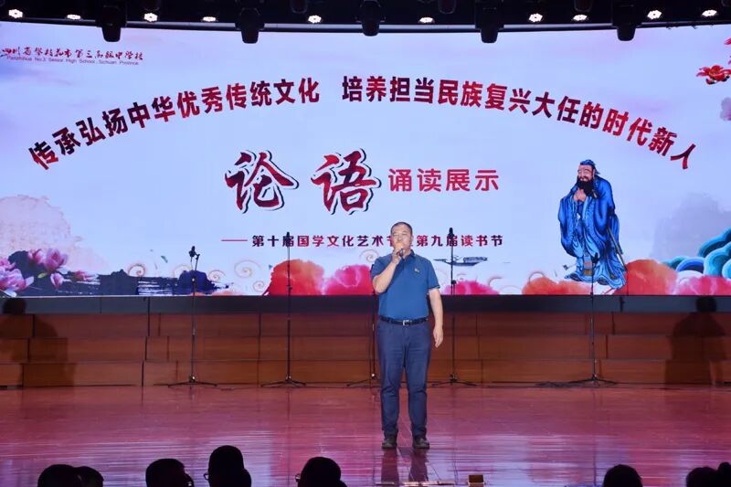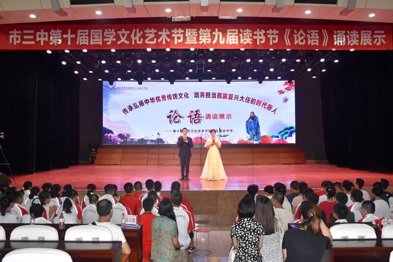 传承弘扬中华优秀传统文化,培养担当民族复兴大任的时代新人!诵读《论语》经典,纪念孔子诞辰2571年,9月28日,由德育科主办、高2023届承办的市三中第十届国学文化艺术节暨第九届读书节之《论语》诵读展示活动在学校图书馆三楼演播厅隆重举行。