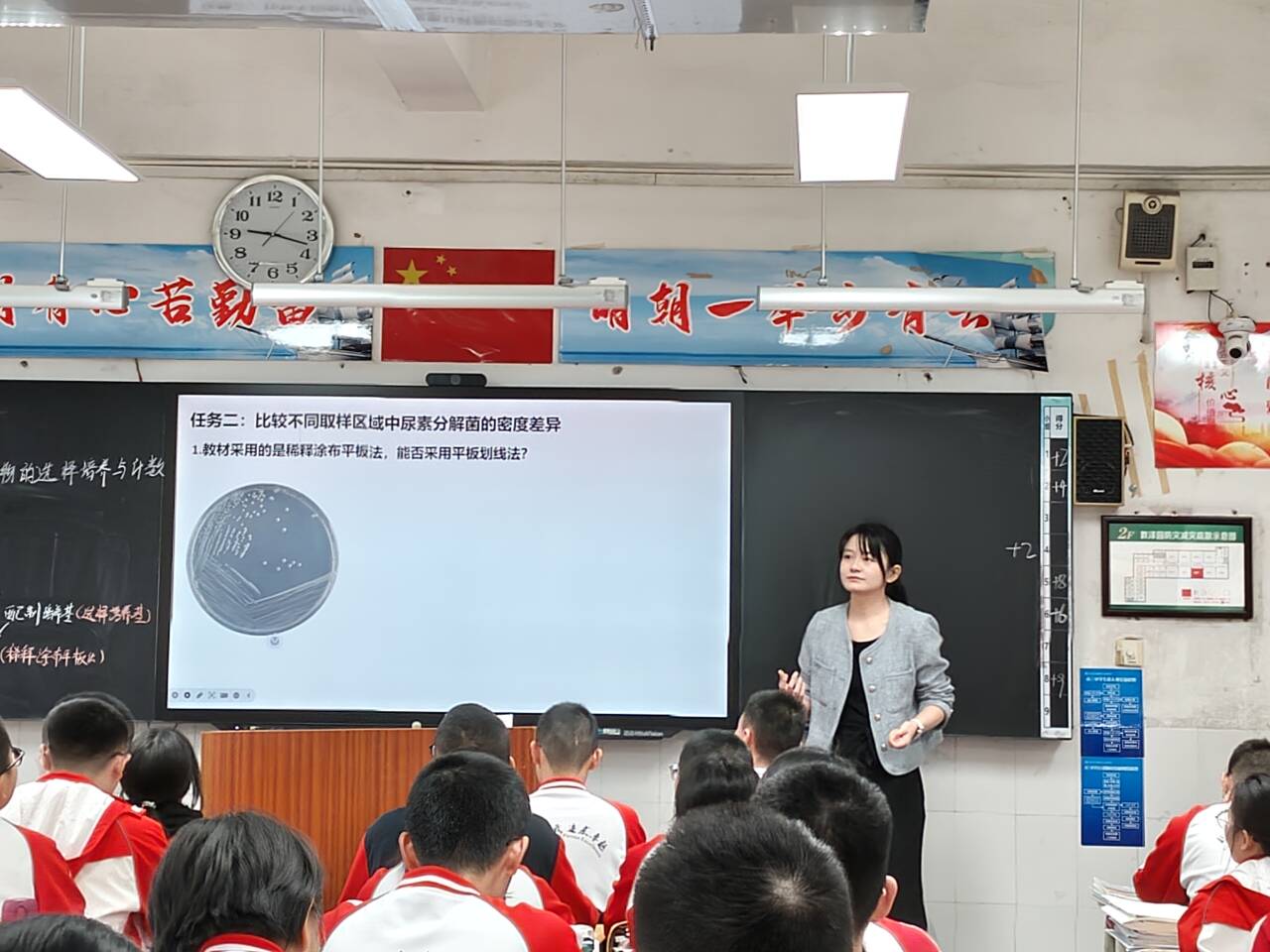 市三中唐月老师为大家带来了一节精彩的展示课——《微生物的选择培养和计数》。唐老师以“探究校园土壤中是否存在能够分解尿素的细菌”为情境导入,引导学生思考选择培养基的设计原理,并通过任务驱动、小组合作探究、实验操作演示等方式,帮助学生掌握微生物计数的方法。整节课教学设计环环相扣,学生活动丰富多样,充分体现了“以学生为主体”的教学理念,展现了唐老师扎实的教学功底和独特的教学风格。