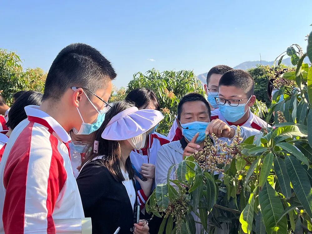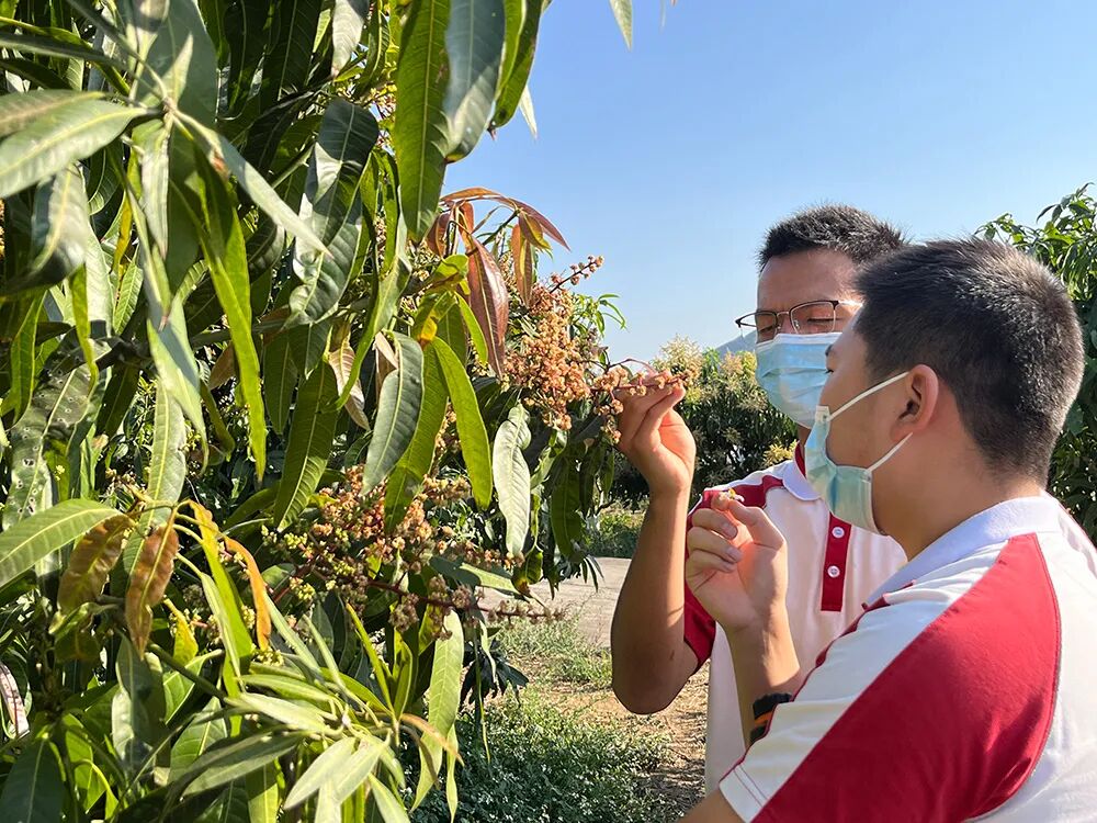 正是芒果花开放的季节,同学们将理论知识运用于实践,观察芒果花序,辩认芒果小花朵类型:两性花(雌花)和雄花,识别完整的芒果花朵结构:花托、花萼、花瓣、花盘、子房、雄蕊和雌蕊等,并尝试进行人工授粉。