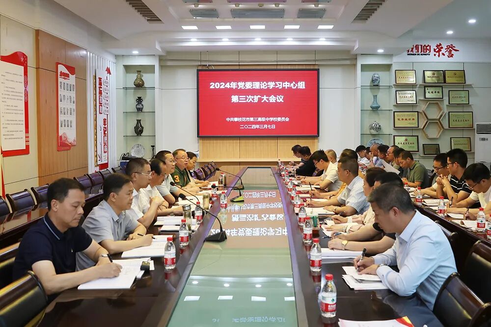 3月7日,市三中党委在图书馆一楼会议室召开2024年党委理论学习中心组第三次(扩大)会议,会议由校党委书记陈柏羽主持,校党政领导班子、全体中层干部、各支部委员参会,相关同志列席会议。