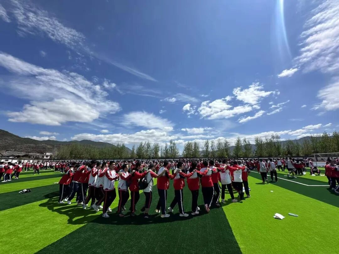 最后的纳西打跳环节,随着纳西打跳的欢快旋律响起,足球场在热烈的节奏中沸腾起来,欢呼与舞步交织成欢乐的盛宴。市三中学子起初脚步生涩,但不过片刻,他们便踩着欢快的节拍,彻底沉醉在这热烈的氛围之中。双方学子一起手拉手、肩并肩,青春的欢笑在雪山脚下回荡。