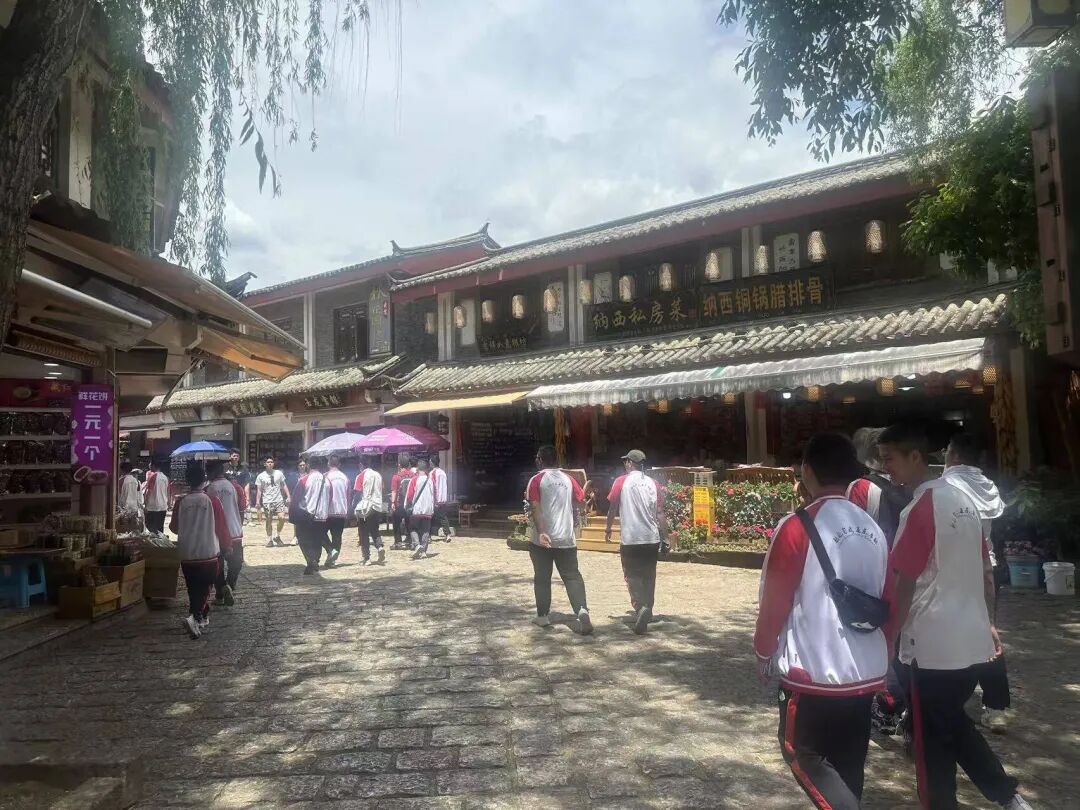 沿着丽江古城蜿蜒的巷道,市三中学子们时而驻足,时而轻抚斑驳的墙面,将纳西族传统民居“三坊一照壁”的精巧布局尽收眼底,青石板路上回荡着他们探索的脚步声。在束河古镇,同学们沿着茶马古道斑驳的石板路行走,这些被岁月磨平棱角的古道,似乎仍在诉说着茶马互市的往昔。耳畔仿佛回荡着悠远的驼铃,眼前依稀浮现出当年商旅络绎、马帮往来的繁华景象。