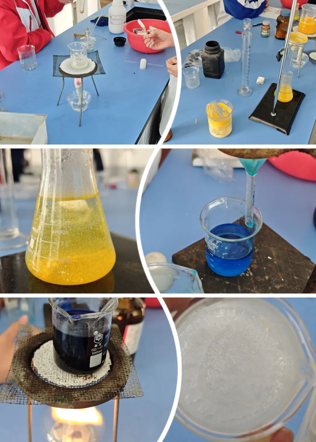 通过讲解重结晶、过饱和溶液的相关知识,结合生动形象的案例和图片,详细介绍了后续进行的实验操作,注重安全性、规范性和严谨性。成员们在认真听讲后,亲手操作,在化学实验室上演了一场场“魔法时刻”。