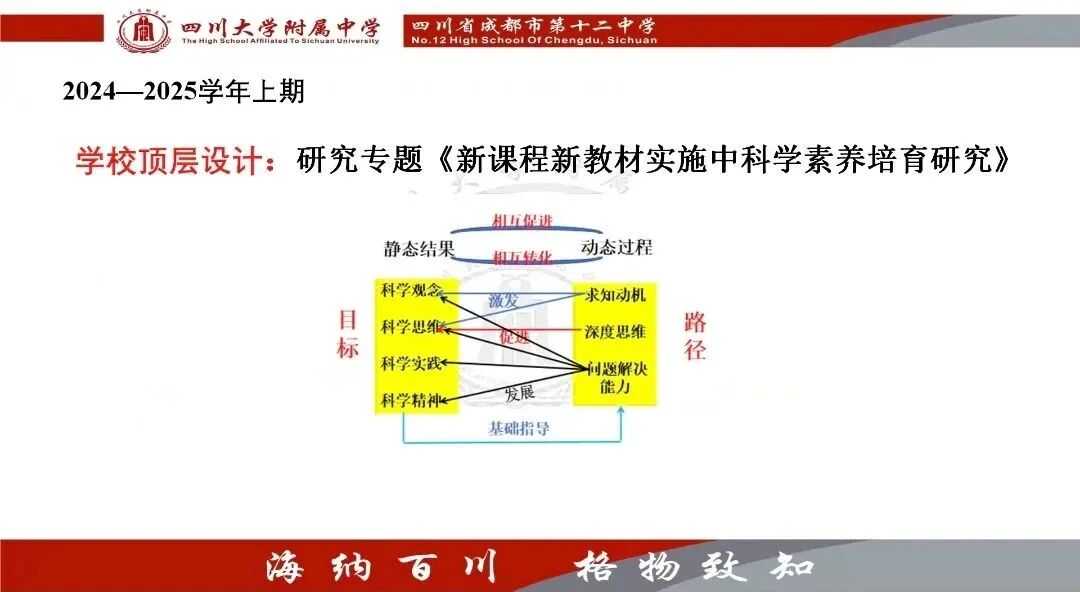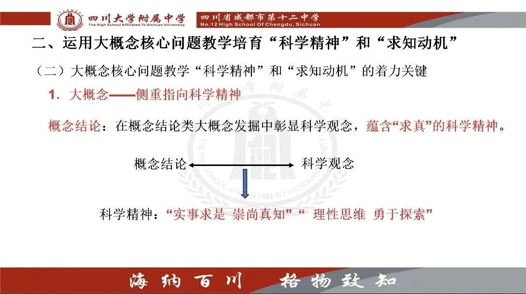 接下来,川大附中熊文俊老师和冯小辉老师主讲《新课程新教材实施中科学素养培育研究(二)》,通过理论与实践结合的方式为我们分享三个要点:分别是进一步认识科学精神与求知动机,运用大概念核心问题教学培育“科学精神”和“求知动机”,现代信息技术赋能科学素养培育。
