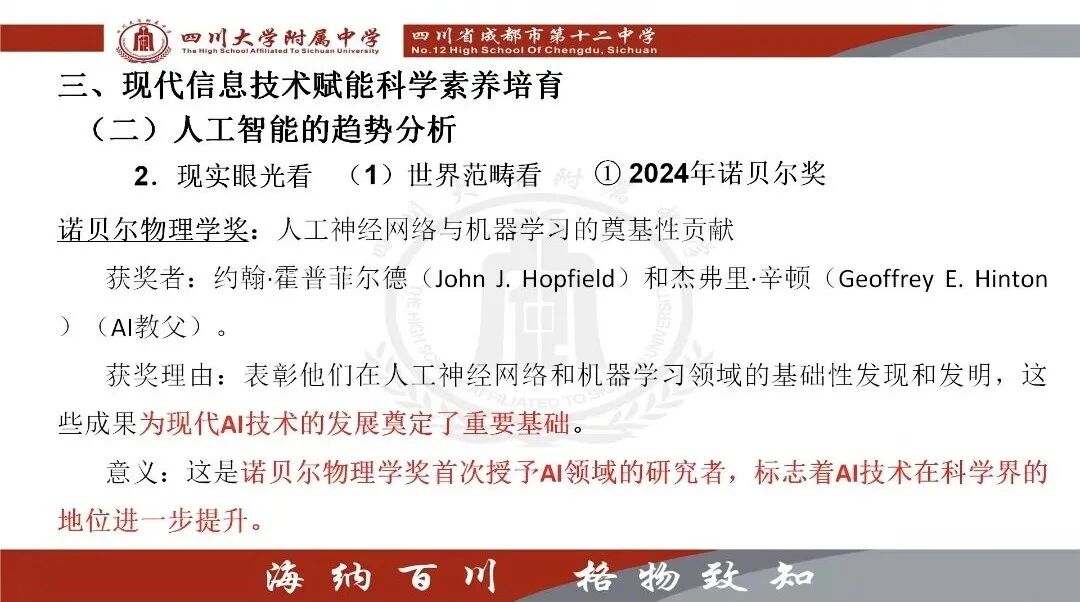 在大概念核心问题教学中提出三层意义:通过“符号意义”(纠错反思→问题解决)、“模式意义”(AI分析立定跳远技术)、“价值意义”(学科与育人双维深化),激发科学精神与求知动机。列举案例语文组通过试卷纠错引导学生构建知识,体育课堂借助AI(“哪吒爱动”、Deepseek)优化训练策略,实现“从被动接受到主动探究”的跨越。
