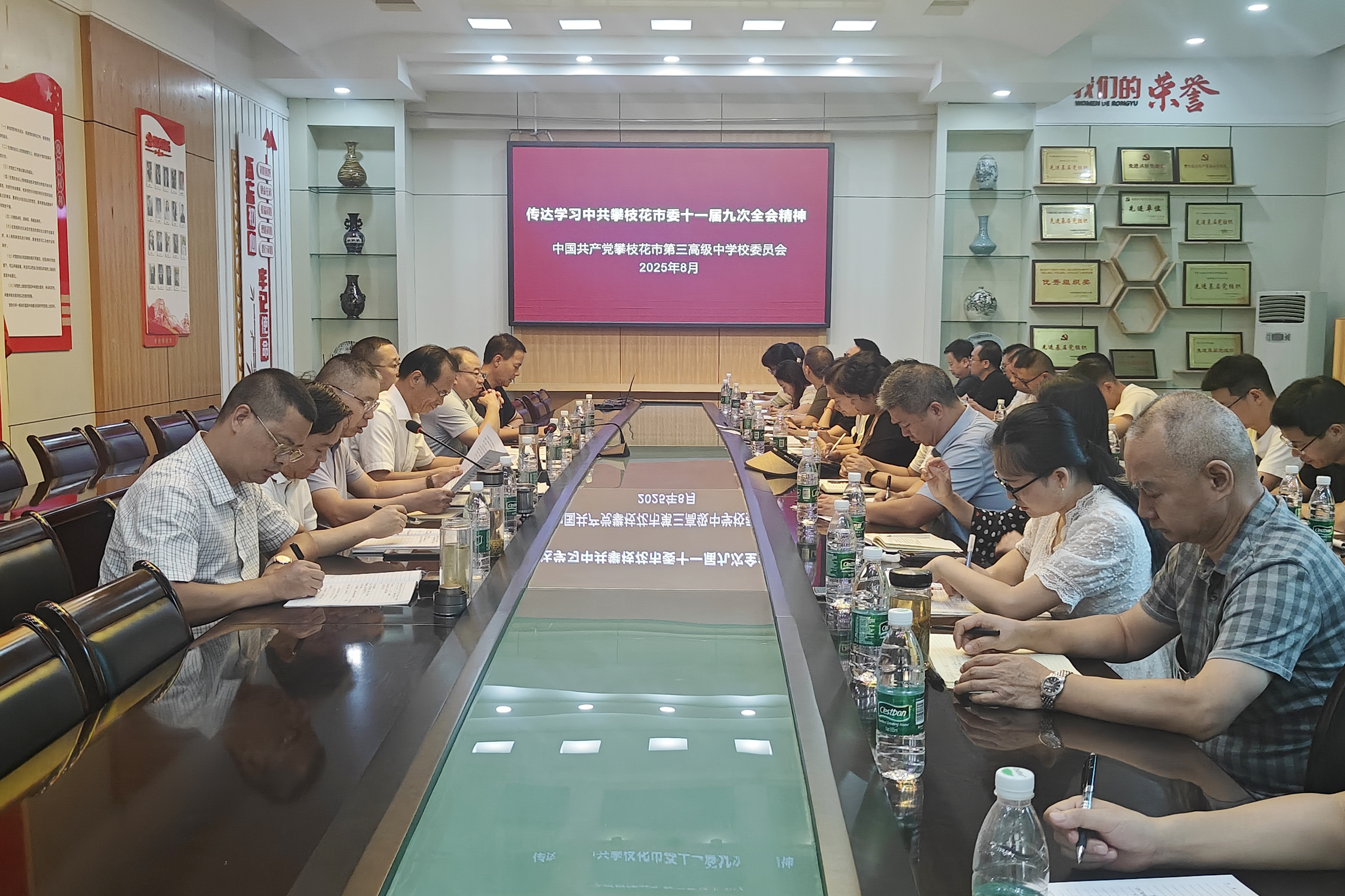 8月28日下午,市三中党委在图书馆一楼会议室召开理论中心组(扩大)第五次学习暨2025—2026学年度开学干部会议,校党委班子成员、中层干部参会,校党委书记陈柏羽主持会议并讲话。