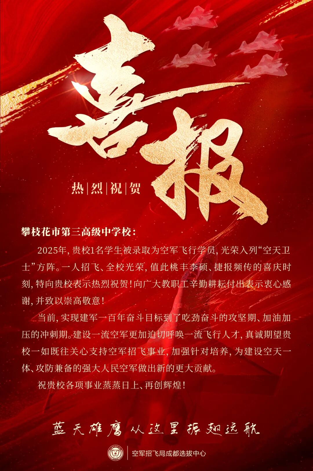 我深知,在党的坚强领导下,人民空军正朝着“空天一体、攻防兼备”加速转型,每一名飞行学员的成长都承载着战斗力生成的时代重任。无论驾驶战鹰巡弋云端,还是扎根地面保障战鹰高飞,皆是以不同方式践行“请党放心,强军有我”的铮铮誓言。在三中学到知识、增长的能力以及塑造的优秀品格都将永远伴我前行。若得他日得遂凌云志,当以钛金之翼丈量山河;纵使折戟沉沙,亦以地勤之姿守护银翼。