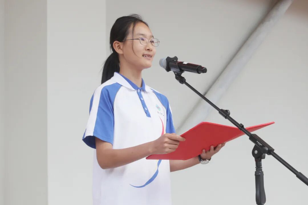 学生代表、高2027届1班黄清蕊同学作了题为《铭记历史,砥砺前行——在新学期的起点上》的精彩发言。时值中国人民抗日战争暨世界反法西斯战争胜利80周年纪念日前夕,她深情回顾了八十多年前先辈们用生命和信念铸就的伟大抗战精神,号召全体同学将个人成长与国家命运紧密相连,珍惜当下,以奋斗姿态开创美好未来。发言结束后,她带领全体同学庄严宣誓,铿锵有力的誓言在校园上空久久回荡。