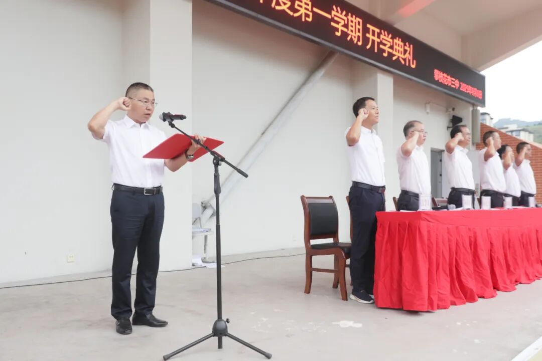 在党委副书记何先全的领誓下,全体教师肃立注目,高举右拳,庄严宣读《三中教师誓词》,铿锵有力的誓言表达了全体教师恪尽职守、立德树人的坚定决心,展现了为人师表的神圣使命感和责任感。