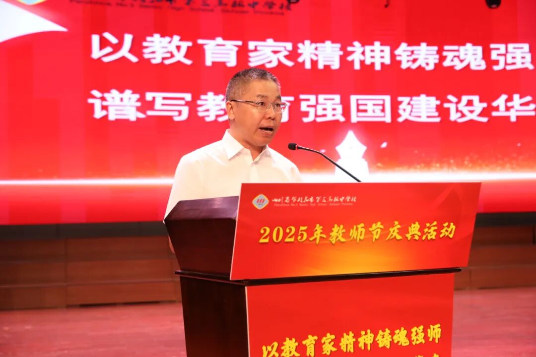校党委陈柏羽书记在致辞中,向全体教职工致以崇高敬意并强调要以教育家精神锤炼理想信念,用习近平新时代中国特色社会主义思想铸魂育人,落实立德树人根本任务;砥砺奋进力量,积极应对教育挑战,投身教育改革创新;涵养初心使命,关爱每一位学生,坚守师德底线;深化自我革命,更新教育理念,善用现代教育技术,努力成为党和人民满意的“大先生”,助力学校高质量发展。