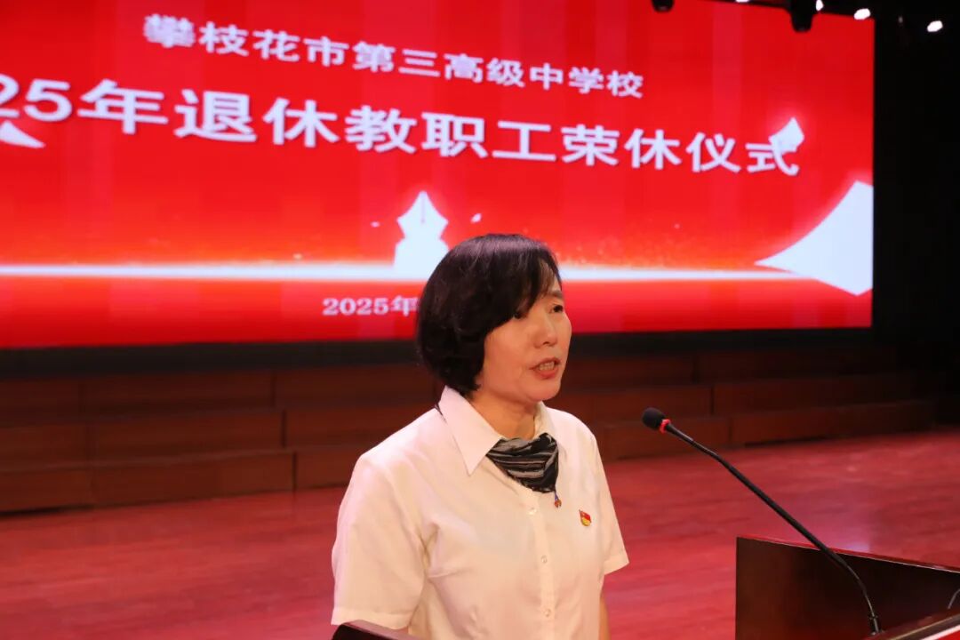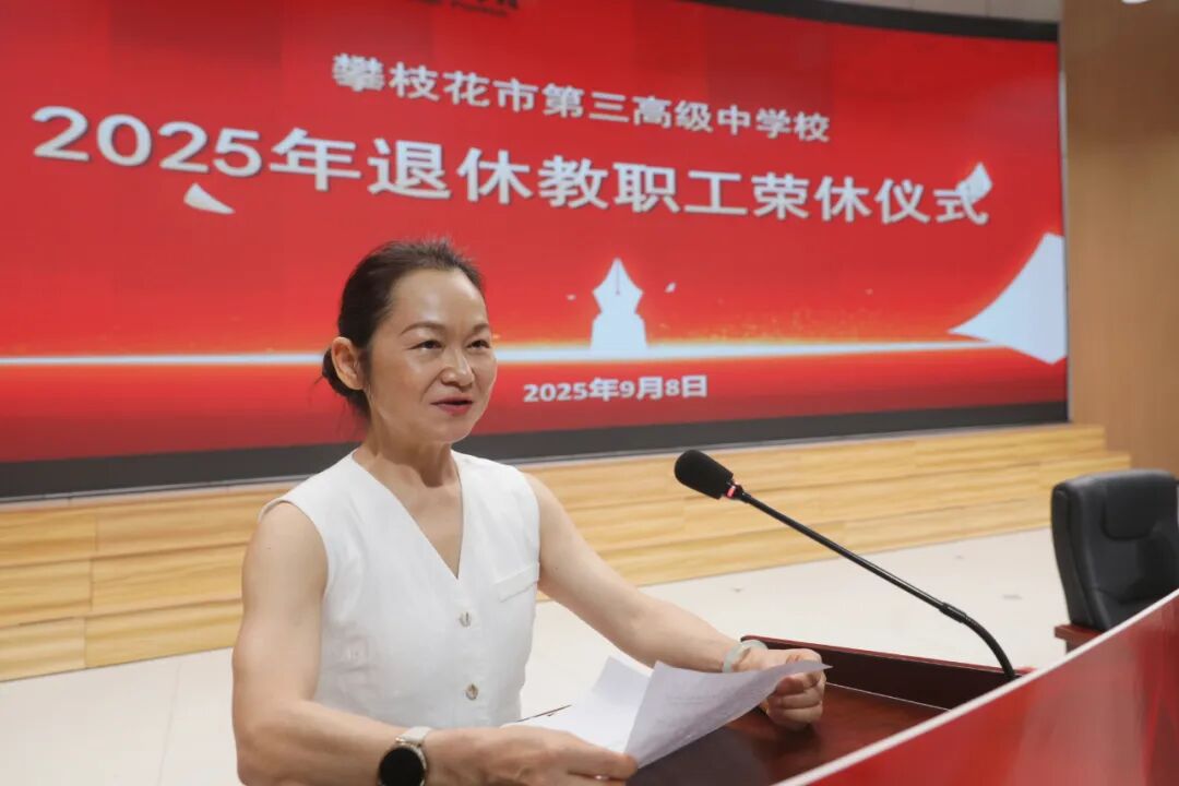 “莫道桑榆晚,为霞尚满天。”在温馨的光荣退休仪式上,赵芹、汪永铭等10 名退休教职工成为主角。赵芹、杨玲作为代表发表荣休感言,言语间满是对三中教育生涯的眷恋。新入职教师代表为退休教师送上纪念品,象征着教育接力棒的交接。校党委委员与退休教师合影留念,让退休教师切实感受到学校的关怀。