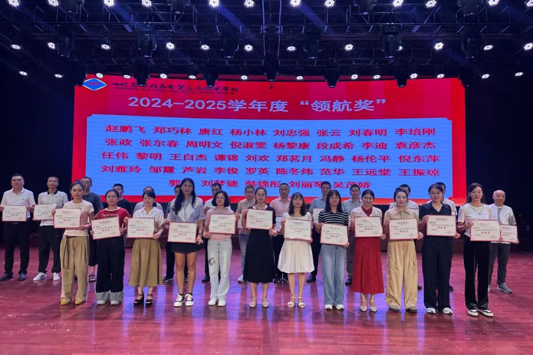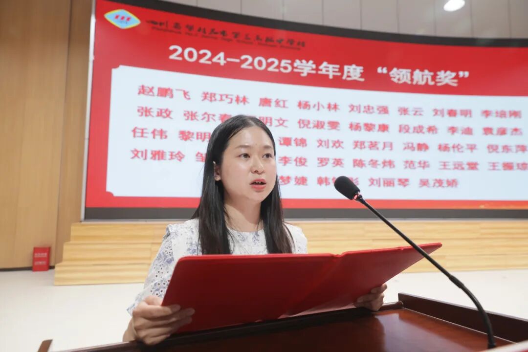 表彰先进环节,39 名教职工荣获2025 年“领航奖”。副校长税荣昌、伍学文宣读获奖名单后,校党委委员为获奖者颁发证书与纪念品,现场掌声雷动。获奖代表刘雅玲、倪淑雯分享教育心得,承诺以“躬耕教坛,强国有我”的志向,为培养时代新人贡献力量。