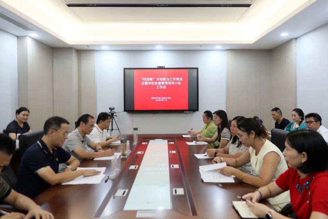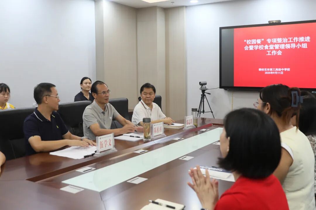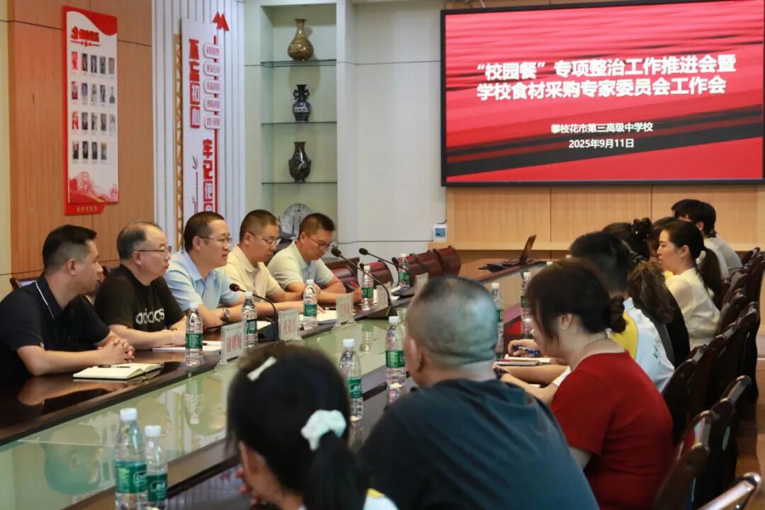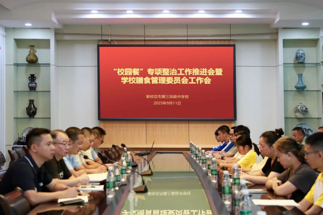 为持续深入推进“校园餐”专项整治工作,进一步压实食品安全责任,优化膳食管理服务,规范食材采购流程。2025年9月11日下午,市三中在钒钛高新校区和学园路校区分别召开“校园餐”专项整治工作推进暨食堂管理领导小组、膳食管理委员会和食材采购专家委员会(简称“一组两委”)工作会。钒钛高新校区由学校食品安全总监伍学文主持,校党委书记陈柏羽出席会议并讲话,学校副校长郭志洪参加会议。学园路校区由学校食品安全管理员林海主持,校党委副书记、校长代座城出席会议并讲话,校党委副书记何先全、副校长税荣昌、市纪委监委驻市三中纪检监察组副组长谢明成参加会议。