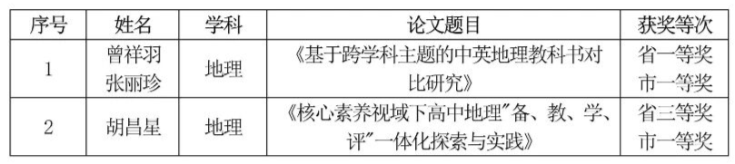 张丽珍、曾祥羽两位老师的论文以其独特的学术价值与显著的实践指导意义,成功折桂,一举夺得市级与省级双料一等奖,胡昌星老师的论文荣获市级三等奖。这些荣誉是市三中地理学科教学团队卓越科研素养与高水平专业能力的集中展现,为学校教研成果再添浓墨重彩的一笔!