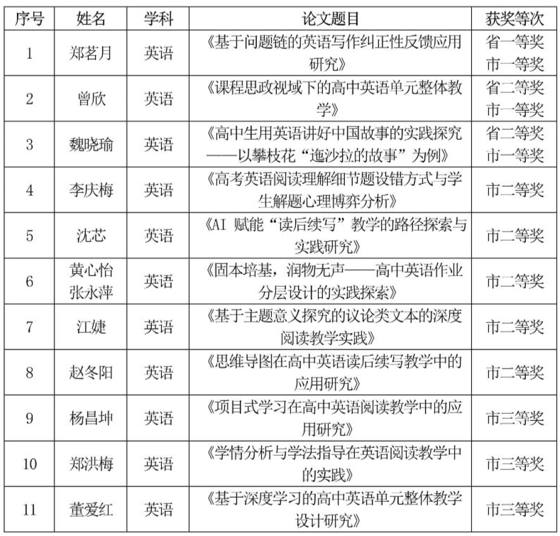我校共有12人次荣获市级及以上奖项。其中,郑茗月、曾欣、魏晓瑜三位教师的论文以前瞻的视角、严谨的论证与创新的实践价值,不仅勇夺市级一等奖,更在省级评选中分别荣获省级一等奖和二等奖;李庆梅、沈芯、黄心怡、张永萍、江婕、赵冬阳六位老师荣获市级二等奖;杨昌坤、郑洪梅、董爱红三位老师荣获市级三等奖。这一连串的佳绩,集中彰显了市三中英语教学团队在理论探索与实践创新方面的雄厚实力。
