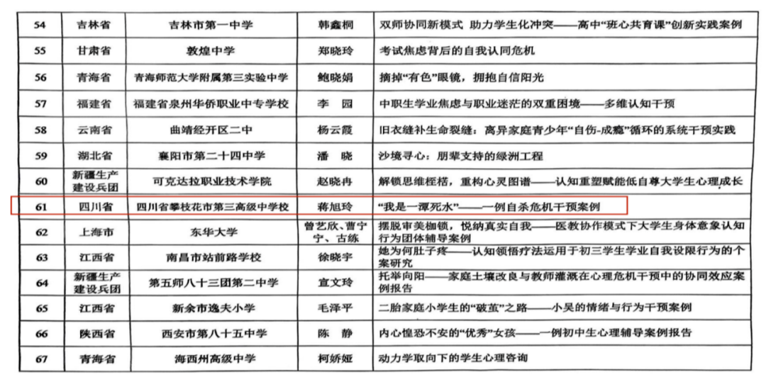 此次入选的案例是蒋旭玲老师主持的 2024 年四川省哲学社会科学基金青年项目的重要科研成果,聚焦心理危机学生成长压力,以专业视角为学生走出困境提供支持,为中学心理健康教育提供了可借鉴、可推广的实践经验。这一成果既是对蒋老师深耕心理危机干预一线工作的高度认可,也彰显了学校长期重视并支持学生心理健康建设的显著成效。
