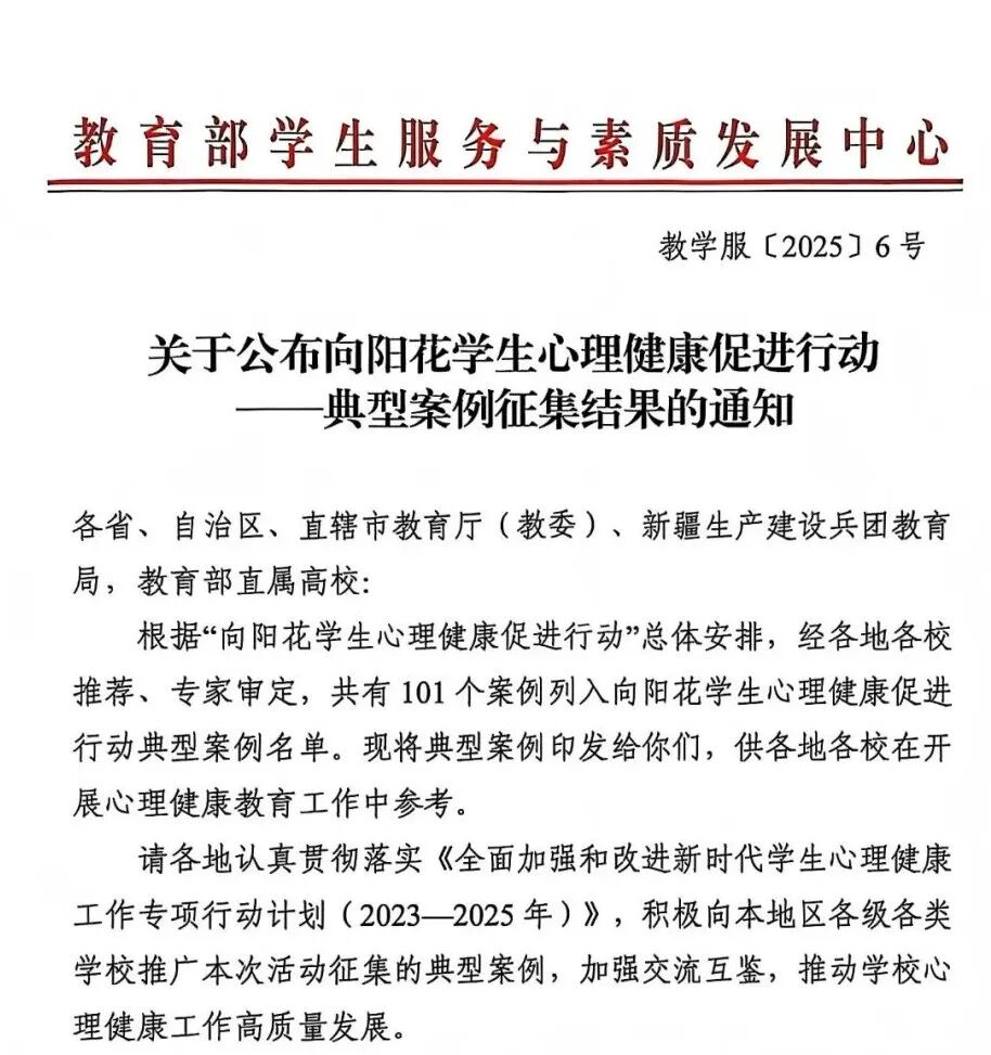 “向阳花学生心理健康促进行动”由中国教育发展基金会等单位联合发起,是落实《全面加强和改进新时代学生心理健康工作专项行动计划(2023—2025 年)》的关键举措。活动旨在总结推广学校心理健康教育先进经验,经全国推荐、专家审定,最终确定101个典型案例,其中教师典型案例 70 篇。